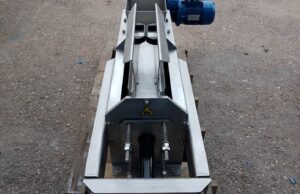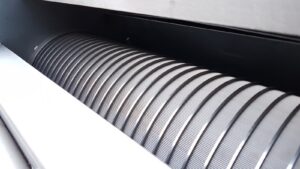 The sludge thickener consists of a cylindrical filter element composed of alternating fixed and moving rings, creating narrow gaps for filtrate discharge. A central screw conveys and compresses the sludge along the cylinder. The movement of the rings provides a self-cleaning effect that prevents clogging.