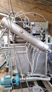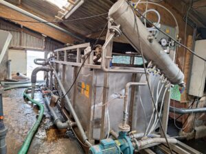 The client needed an effective wastewater treatment solution within the constraints of an existing, low-height barn structure. After mechanical separation of manure using a drum screen and press, the remaining wastewater still contained fine solids and dissolved pollutants. Limited installation height and space made it difficult to implement conventional treatment systems.