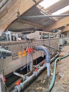 A compact, low-profile Dissolved Air Flotation (DAF) unit was supplied and installed, specifically designed to fit within the restricted building height. The system was integrated downstream of the drum screen and manure press, treating the remaining process water to remove fine suspended solids and residual contaminants.